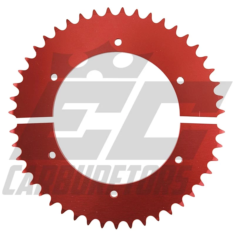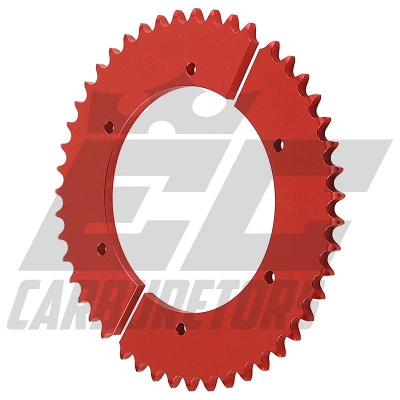The increased power demanded a strong sprocket and drive train over the traditional karting #35 sprocket and drive train. They are made with the standard six-bolt 5.25″ bolt circle and 4.5625 bore to fit the common sprocket carrier. We highly recommend using a heavy-duty sprocket carrier like our 3602. These sprockets are manufactured with 0.25″ high-quality aluminum, hard-anodized bright red for added durability, and a great look.